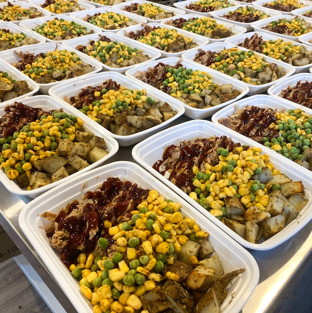 Porc effiloché au barbecue avec pommes de terre Yukon rôties, petits pois et maïs